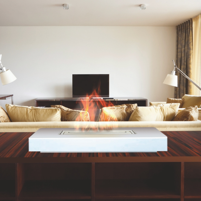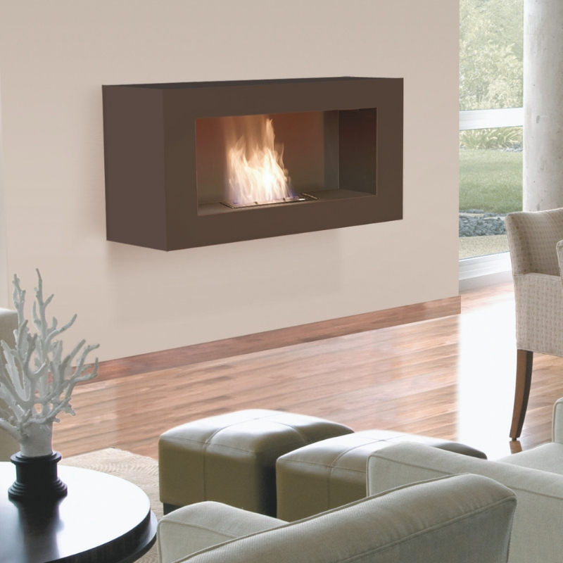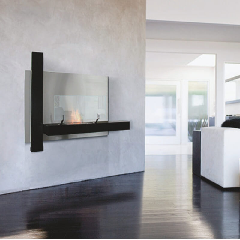 Cheminée indoor éthanol Manhattan, modèle avec bloc de combustion. Cheminée murale en acier laqué époxy avec brûleur en inox brossé.