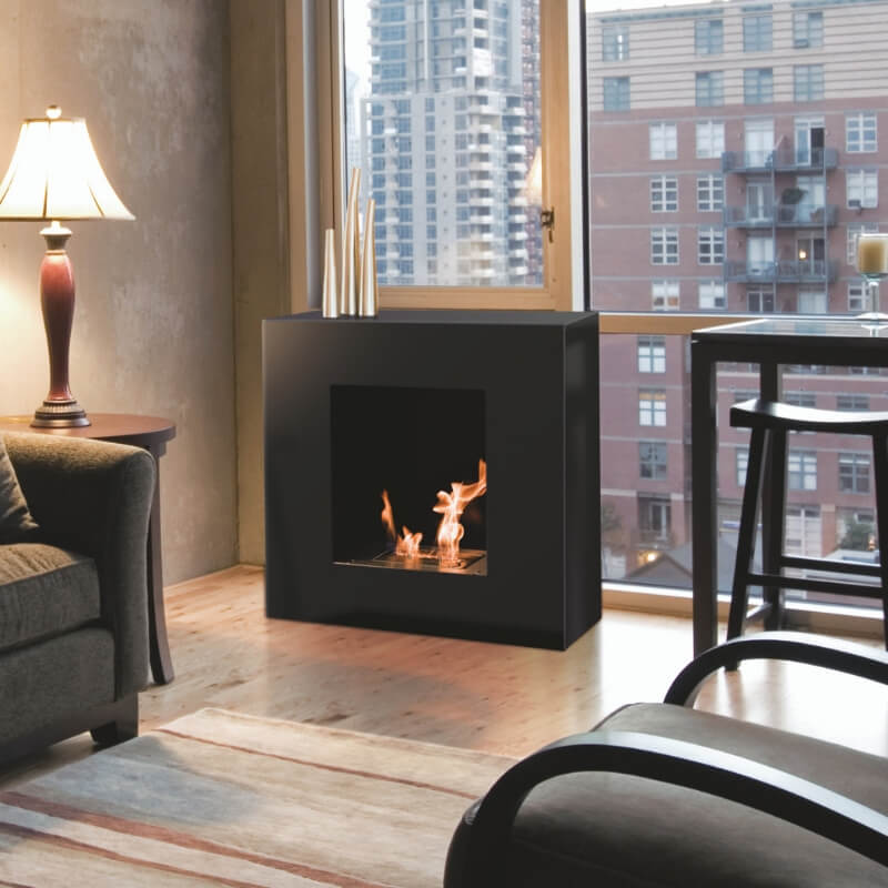 Cheminée indoor éthanol Oxford, modèle avec bloc de combustion. Cheminée métal à adosser avec brûleur en inox brossé. Donnez de la chaleur à votre pièce à vivre !