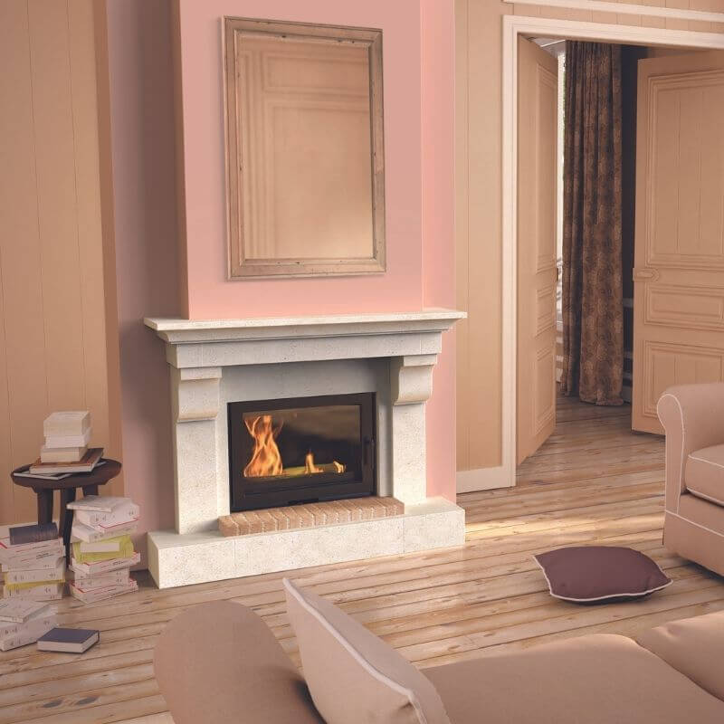 Cheminée Chenonceau, de face sur coffrage. Encadrement en pierre de Lactora, intérieur du foyer habillé de briquettes artisanales nuance rosée.