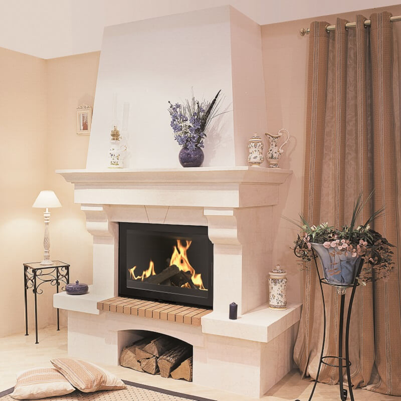 Cheminée Fontainebleau, modèle de face. Encadrement en pierre du Lubéron, foyer encadré (retombée et plaque foyère) de briquettes industrielles jaune flammé.