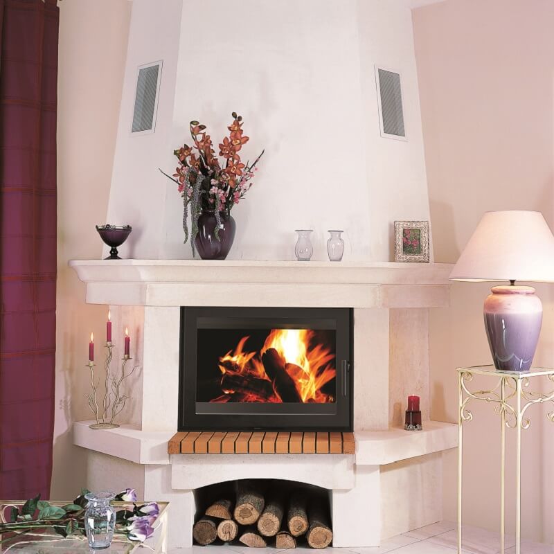 Foyer à bois P75, 1 face vitrée. Ce foyer de 75cm de largeur pourra être installé dans une cheminée de face adossée ou encastrée.