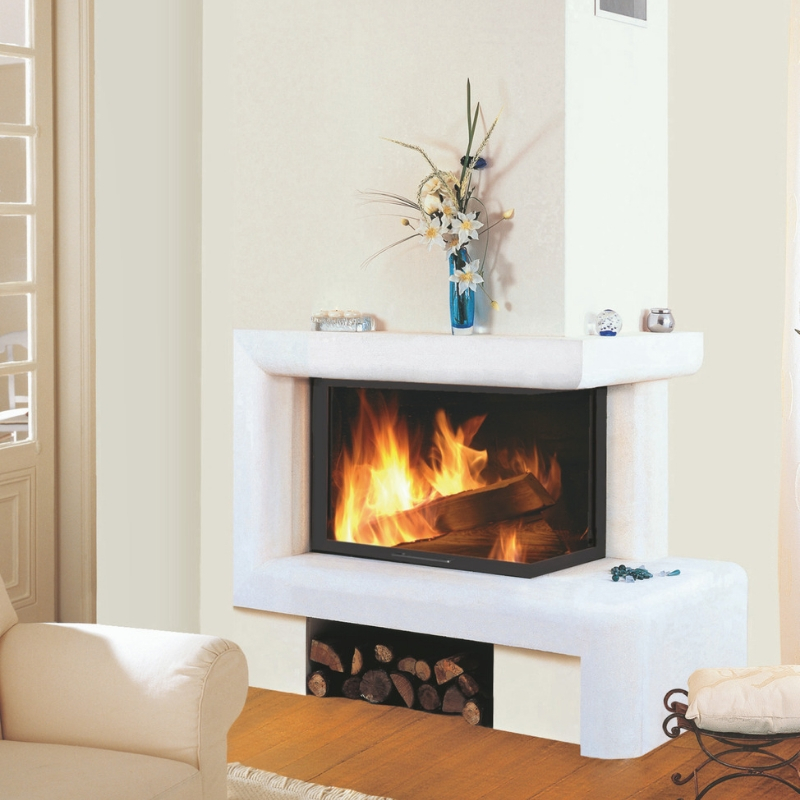 Cheminée Bogota, modèle de face ou d’angle sur coffrage. Cheminée contemporaine avec cadre en pierre du Lubéron, possibilité de tablette en brèche de marbre ou en granit.