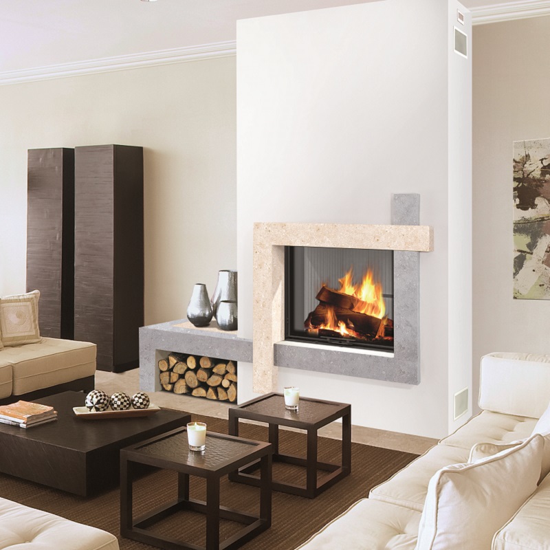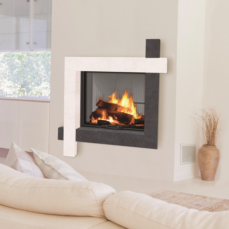 Cheminée Constellation 242, modèle de face ou d’angle sur coffrage. Cheminée contemporaine avec cadre en pierre beige Ibère, tablette et plateau en brèche de marbre.