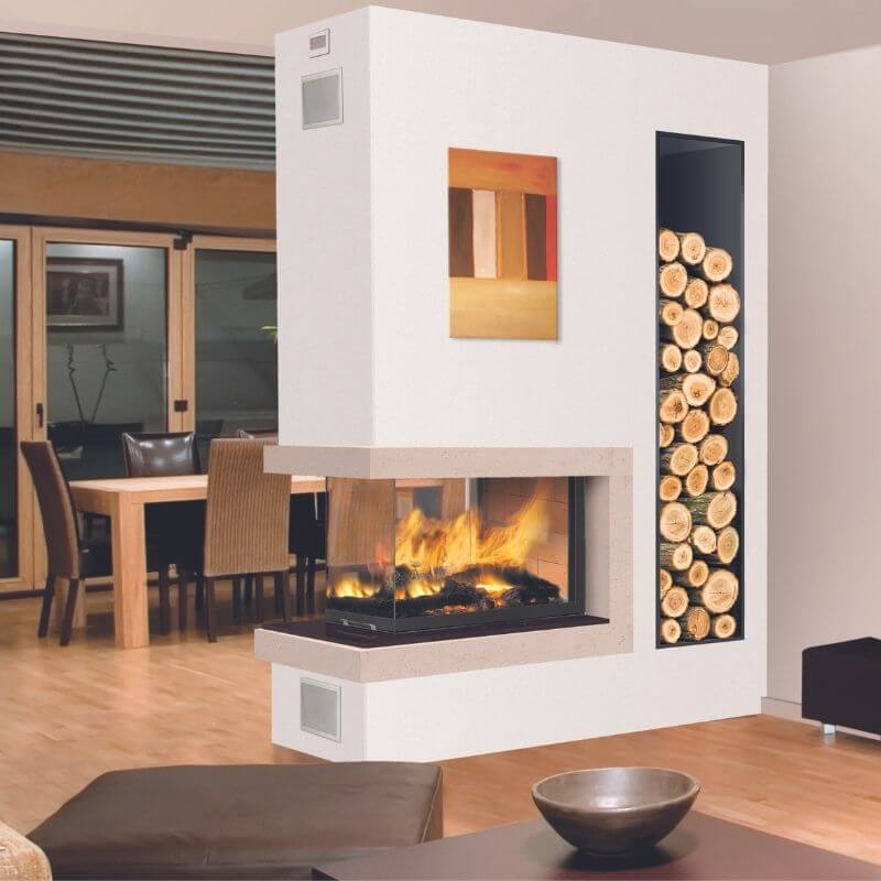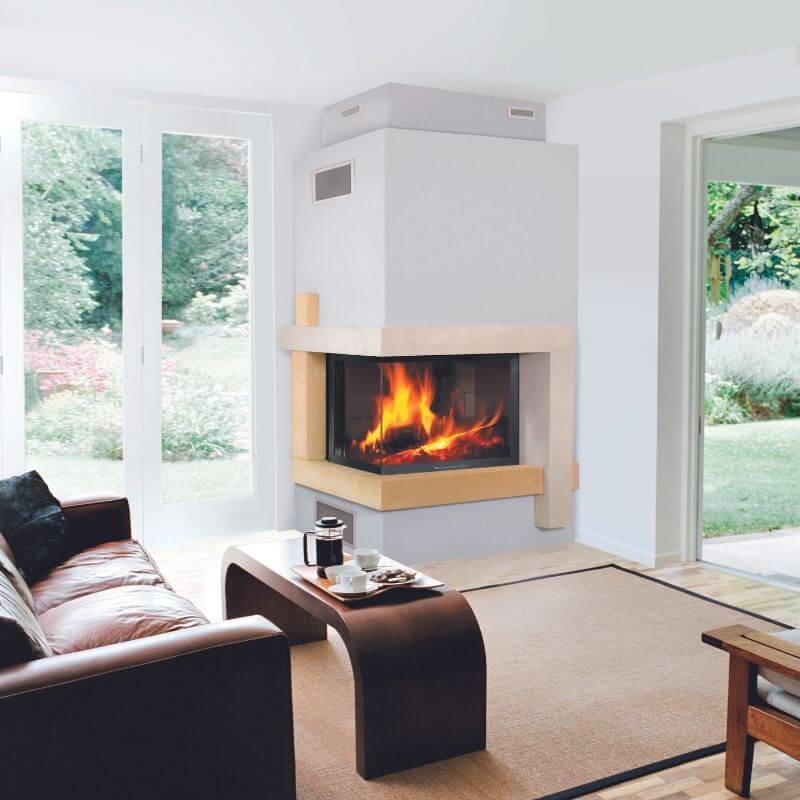 Cheminée Ibiza Corner, modèle d’angle sur coffrage. Cheminée contemporaine avec cadre en pierre du Lubéron et en pierre de Dordogne.