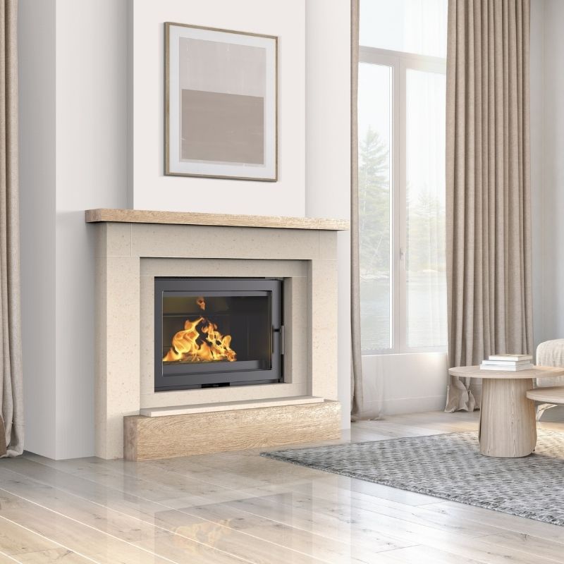 Cheminée Lisy, modèle de face sur coffrage. Cheminée contemporaine avec entourage en pierre beige Ibère et tablette en chêne massif brut.